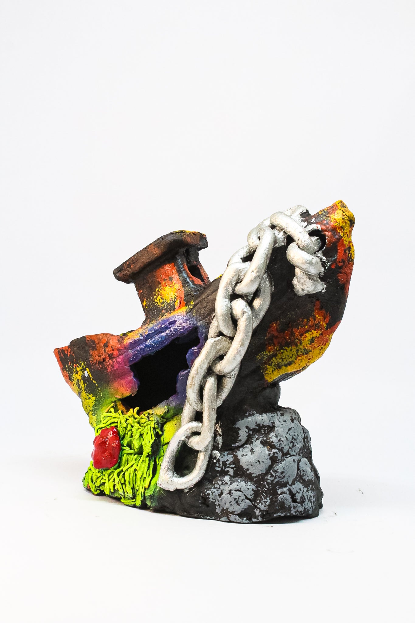 Barco de cerámica con cadena, ideal para acuarios medianos. Su diseño realista y detalles de cadena lo convierten en un atractivo elemento decorativo y funcional al mismo tiempo.