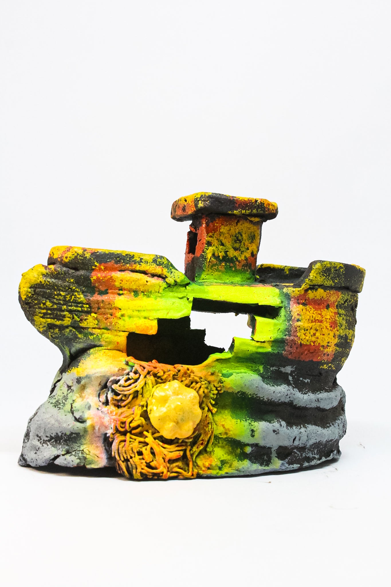 Decoración en forma de barco naufragado de tamaño mediano, ideal para acuarios de tamaño medio. Su estructura detallada ofrece tanto estética como funcionalidad para los peces.