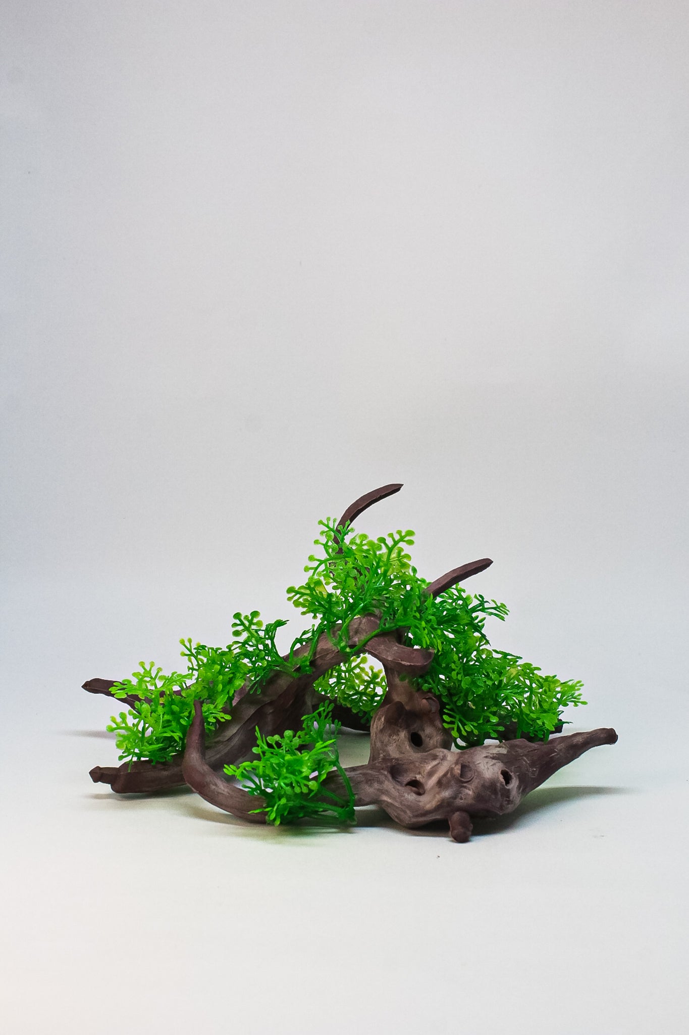 Planta artificial de plástico con un tronco realista en su base, ideal para agregar un toque natural a tu acuario.